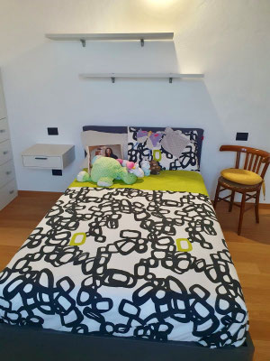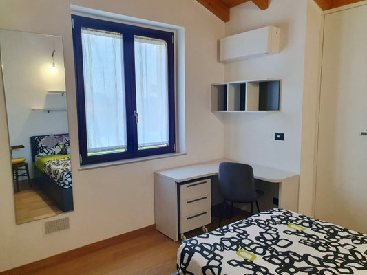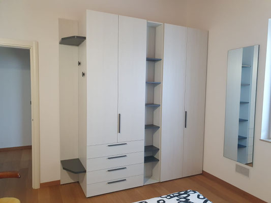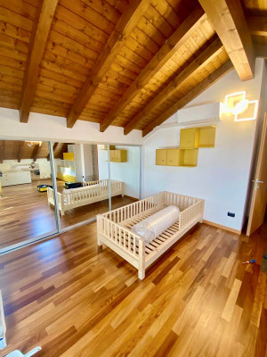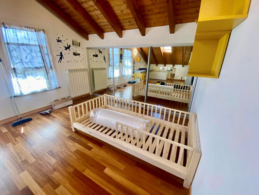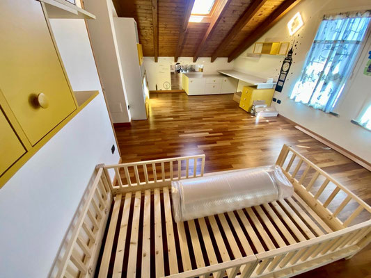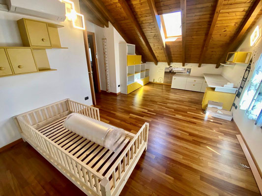 Cameretta Nidi di Battistella in ambiente mansardato, con ante scorrevoli a specchio, attrezzatura interna a misura con paleria di Zemma, zona studio e scrivania,