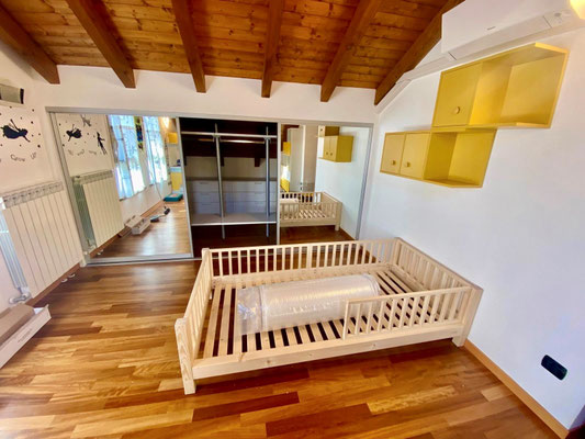 Cameretta Nidi di Battistella in ambiente mansardato, con ante battenti e libreria a giorno,